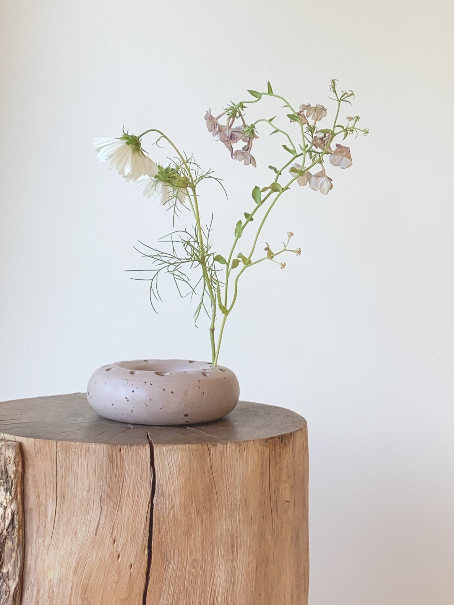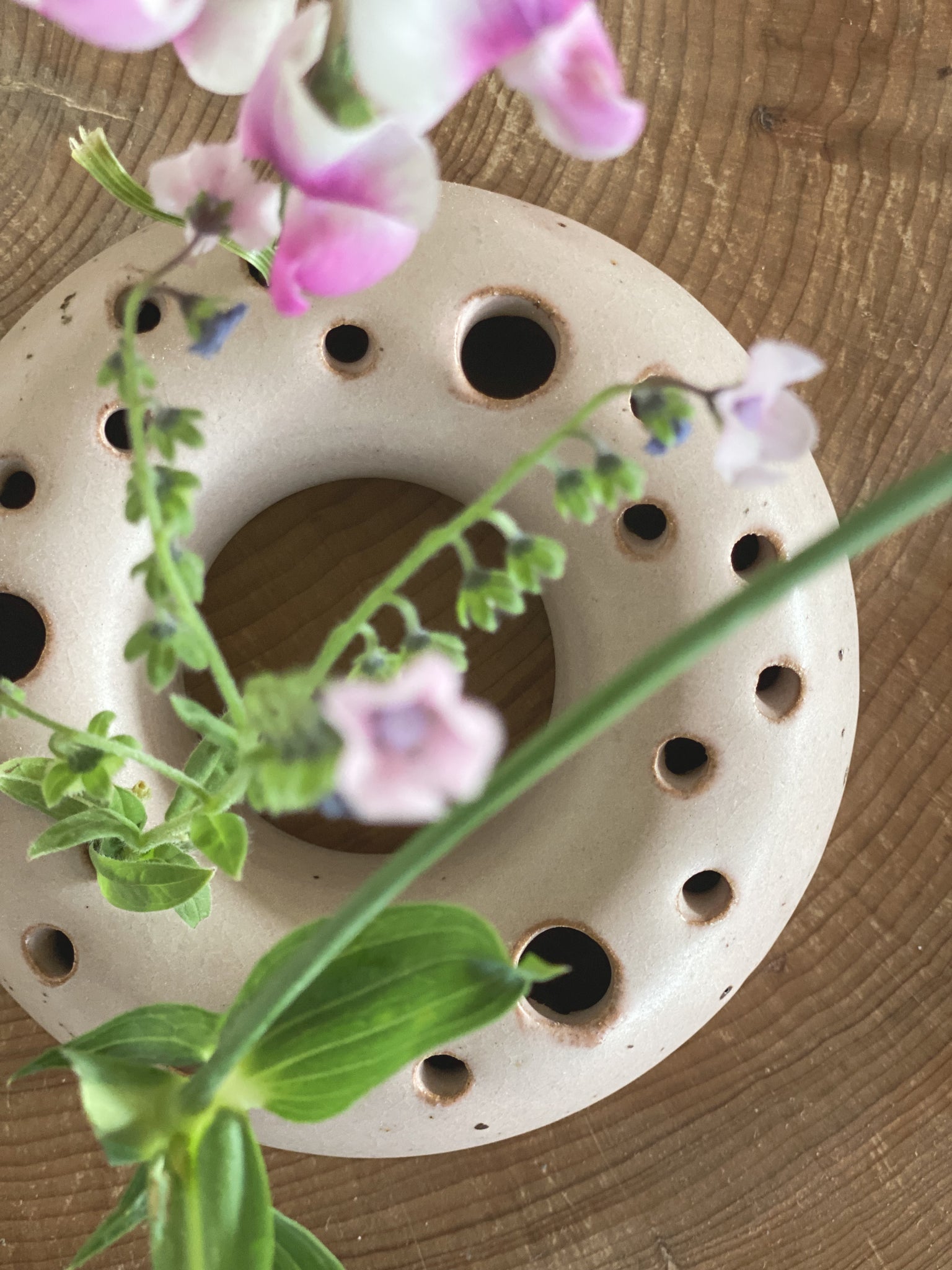 forage hoop - stoneware - rose - volcanic sand speckle with matte glaze. Several holes to place your favourite foraged blooms in. You can put water into your hoop.